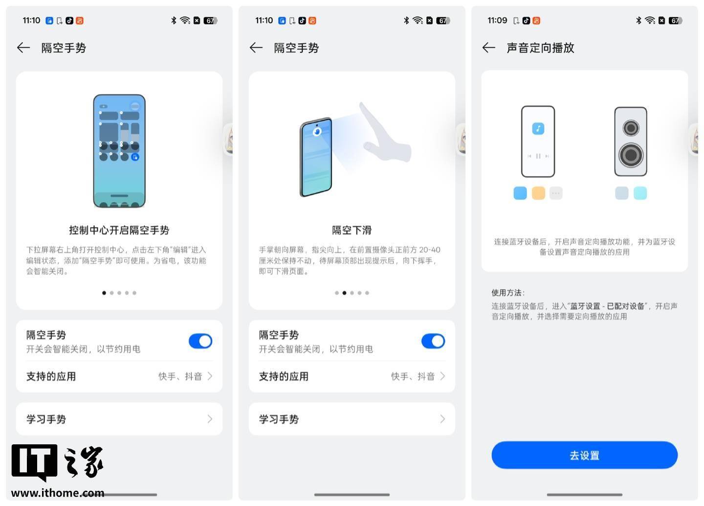 细节体验上,还有声音定向播放功能,简单来说就是蓝牙和手机双路播放不同音频,互不影响;隔空手势功能既炫酷也实用。